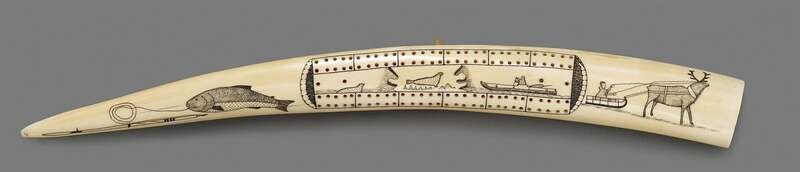 Decorated with fish, seal hintng scenes, a Caribou sl, birds, seals on an ice flow, bear and fox.