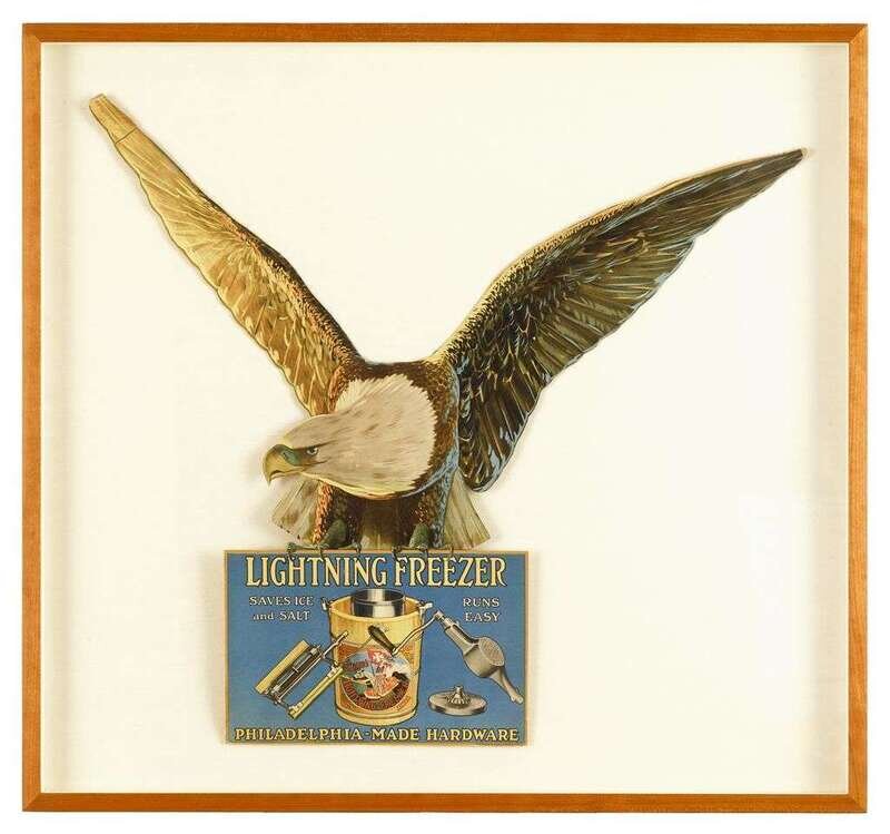 An eagle with wings spread perched on top of a sign reading "LIGHTNING FREEZER SAVES ICE AND SALT RUNS EASY PHILADELPHIA-MADE HARDWARE," framed.