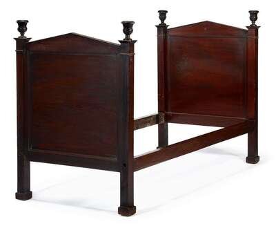 Square-turned posts with urn finials enclose pedimented and paneled head and footboard, Marlborough feet.