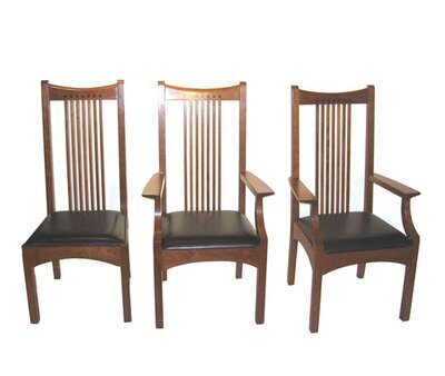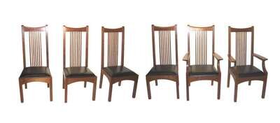 The rectangular top having canted corners, black edge to frieze with black square decoration above spindle rectangular legs together with two spindle arm chairs and four spindle side chairs having a concave crest rail, flared arms, leather seat on square straight legs. Table and chairs branded "Stickley."