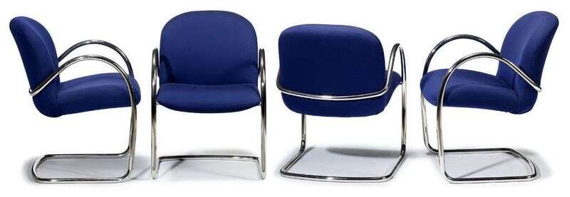 Having blue upholstered back and seat on chrome frame with metal label: "Brueton Springfield Gardens NY USA."