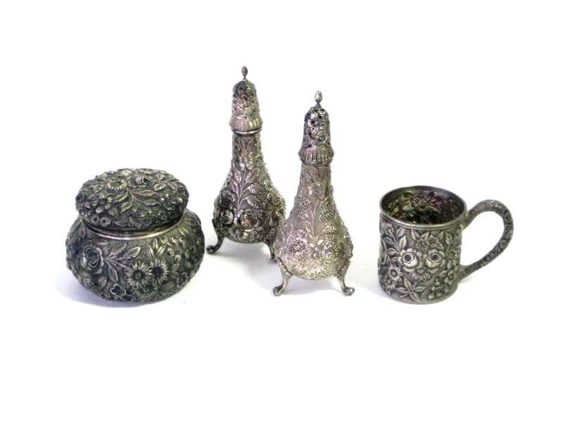 Including a pair of footed salt and pepper shakers, a child's cup with monogram, and a powder jar with lid, all with repousse floral decoration.