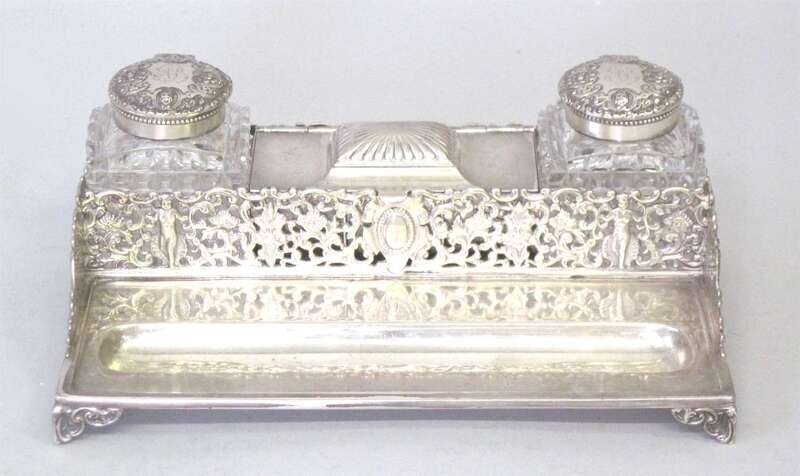 Having a reticulated gallery with figural, shell, leaf, "C" scroll and center cartouche enclosing a center lift lid three section compartment flanked by two cut glass inkwells, monogram.