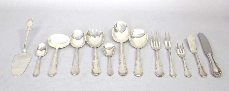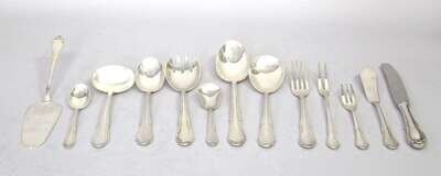 Comprising eight dinner forks, eight pastry forks, eight hollow handle dinner knives, eight teaspoons, eight tablespoons, flat handle butter spreader, serving spoon, salad serving set, small serving fork, pie server, gravy ladle, sugar spoon, all stamped "925 Sterling GR."