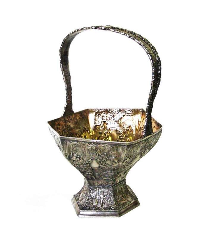 Arched stiff handle over octagonal basket pressed to show Dutch farming scenes, over conforming base.