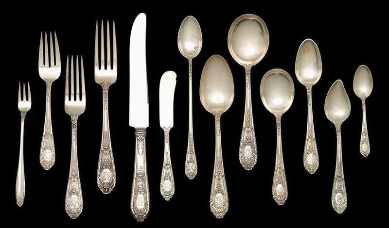 "Fontaine" pattern including eleven hollow handle dinner knifes, twenty two dinner forks, thirteen salad forks, twelve buillon spoons, twelve cream soup spoons, eight tablespoons, twelve iced-tea spoons, twelve flat butter spreaders, twelve seafood forks ( one the Prelude pattern), six citrus fruit spoons, eighteen teaspoons and eleven demi-tasse spoons. ( 164 pcs).
