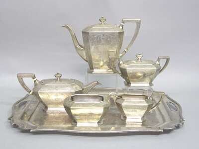 Engraved "Fairfax" pattern, including hot water pot, tea pot, covered sugar bowl, creamer and waste bowl, together with an oblong silver plated 21 1/2 inch two handled tray, 6 pcs.