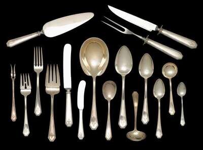 "Queen Anne" pattern comprising twelve dinner forks, twelve salad forks, twelve hollow handle dinner knives, twelve flat handle butter knives, twenty four teaspoons, twelve demitasse spoons, one cold meat fork, one lemon fork, one sauce ladle, one sugar spoon, one berry spoon, one hollow handle carving set, and one hollow handle cake server, all with monogram.