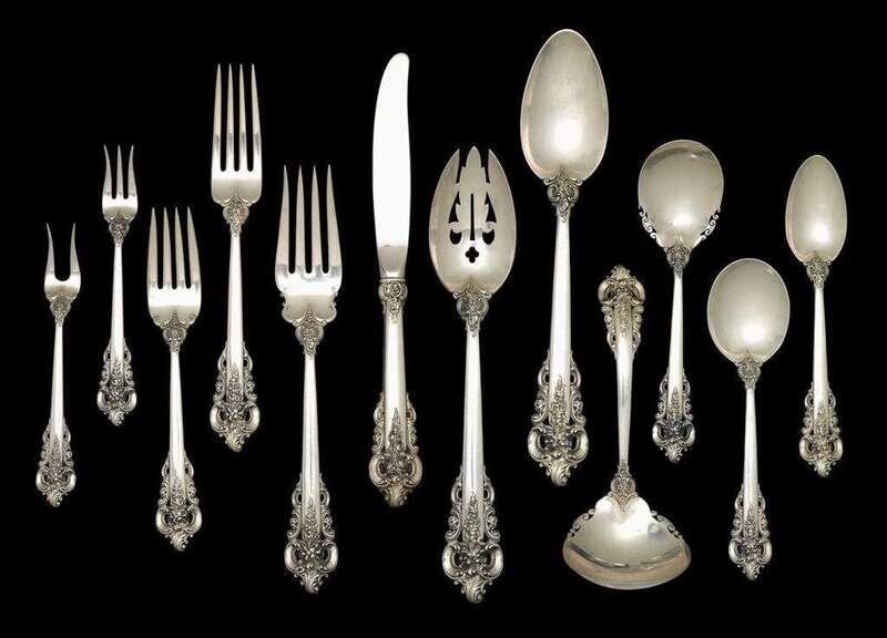 "Grand Baroque" pattern comprising twelve dinner forks, twelve salad forks, twelve cocktail forks, twelve hollow handle dinner knives, twenty four teaspoons, twelve cream soup spoons, one pierced serving spoon, one gravy ladle, one sugar spoon, two cold meat forks, one relish fork, and one serving spoon.