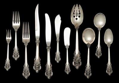 "Grand Baroque" pattern including twelve dinner forks, twelve salad forks, twelve cocktail forks, twelve hollow handle dinner knives, twelve hollow handle steak knives, twelve flat handle butter spreaders, one hollow handle butter spreader, twenty four teaspoons, twelve cream soup spoons, and one salad set.