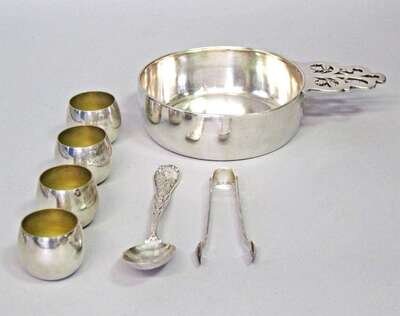 With pierced handle having leaf and scroll decoration together with four squat form cordial cups with vermeil wash to inside, sugar tong, and New York souvenir teaspoon with etched Brooklyn Bridge decoration to bowl of spoon and Statue of Liberty decoration to handle.