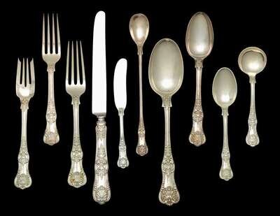 "English King" pattern, including twelve dinner knives, thirteen dinner forks, ten cream soup spoons, ten fish forks, eight luncheon forks, eight bouillon spoons, thirteen flat butter spreaders, twelve teaspoons, nine iced tea spoons and one serving spoon, monogram,96 pcs. .