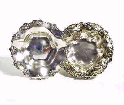 With scalloped edge having applied floral decoration together with a sterling silver bowl with wide vermeil floral and "C" scroll decorated scalloped edge.