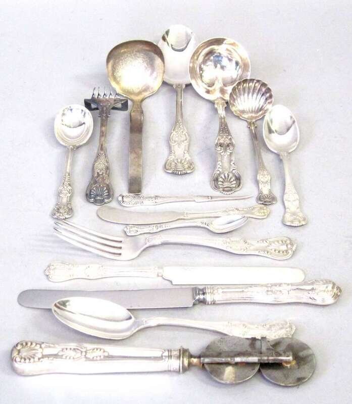 "King" pattern inclucing twelve dinner forks, twelve dinner knives, twelve cream soup spoons, ten flat luncheon knives, twelve flat butter spreaders, twelve demi tasse spoons, two sugar shells (Tiffany), nut pick (R and W Wilson), six table spoons, sauce ladle (R and W Wilson), sauce ladle and cream ladle, 82 pieces.