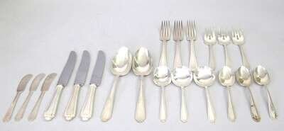 "Linden" pattern, including eight dinner forks, eight dinner knives, eight salad forks, seven cream soup spoons, eight tea spoons eight flat butter spreaders and two table spoons, 49 pcs.