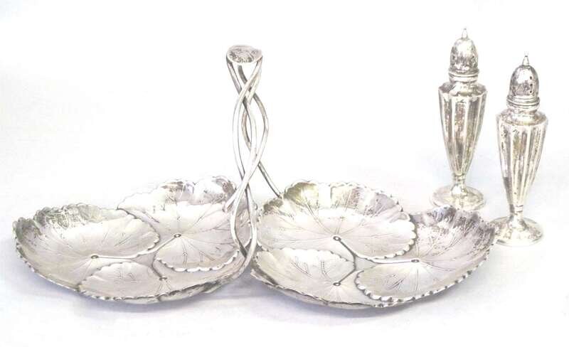 Having leaf decoration and twisted handle together with sterling silver footed salt and pepper shakers of panelled and tapering form.