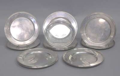 Thread circular borders, eight by Mueck-Cary Co. and six by International, together with a silver rimmed glass lemon tray, 15 pcs.