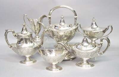 "Portsmouth" pattern, engraved, comprising a hot water kettle, coffee pot, teapot, creamer, sugar, and covered sugar, all with monogram.