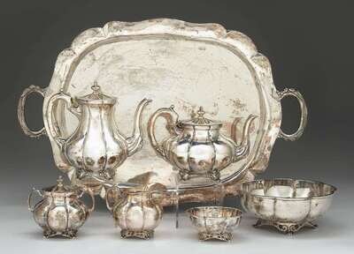 Plain ribbed melon form, squat urn finials to lids on openwork scroll bases, including hot water pot, tea pot, covered sugar bowl, creamer and waste bowl, together with a 25 7/8 inch scallopped edge oblong tray with twin loop handles, 6 pcs.
