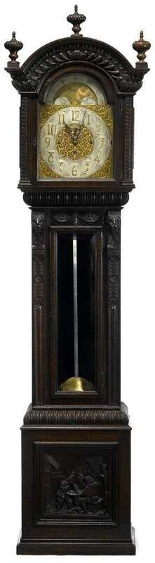Arched cresting to bonnet with carving, flat carved columnettes beside door, silvered and brass moon phased face, Arabic numeral chapter ring, pierced circular center and corners, name plate "Tiffany & Company", molded framed and glass waist door with carved sides, drinking scene carved base panel, flush molded base.