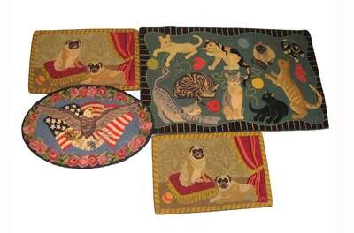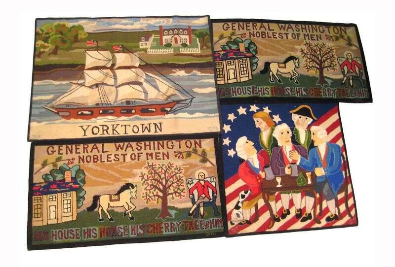 Including scenes of Yorktown, George Washington and his cherry tree, colonists sitting around a tavern table, cats with mittens, dogs, and eagle set against American flag, all signed. Two rugs by Nancy Thomas and Claire Murray.