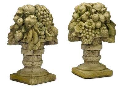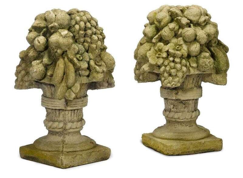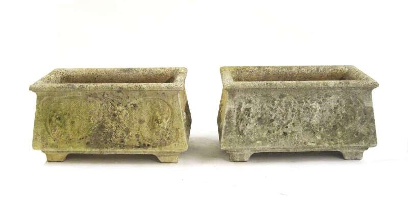 On a square base together with a pair of cast-stone planters of rectangular form raised on a bracket foot.