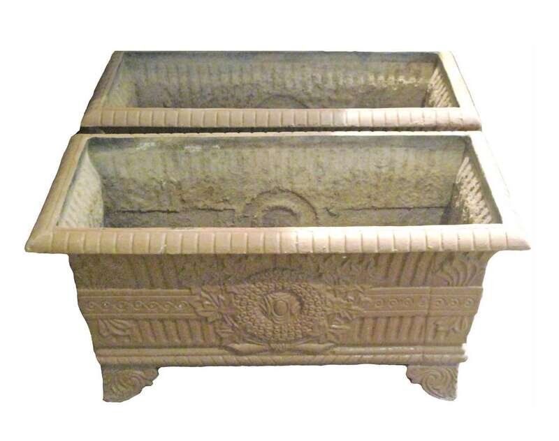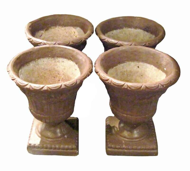 Each with a fluted body with garland decoration on pedestal and square base together with a pair of brown painted cast-metal planters of rectangular form with a centered cartouche surrounded by a wreath and leaves.