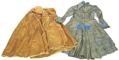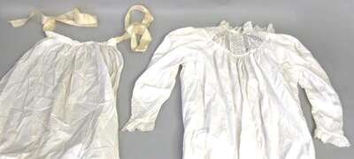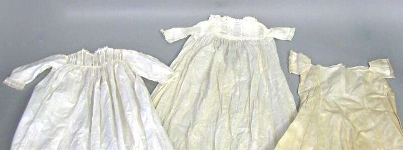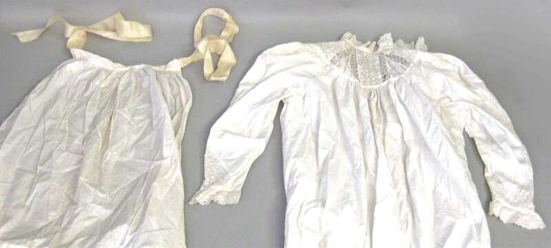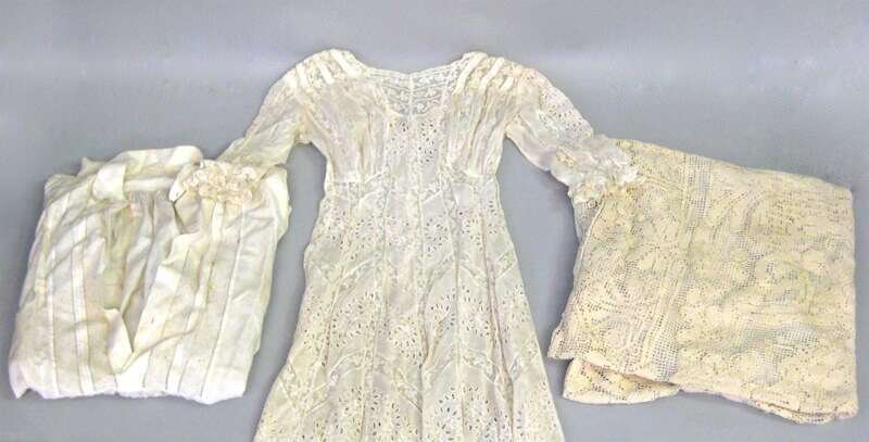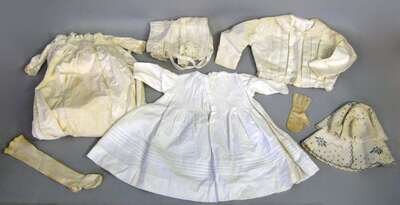 Most of cotton or linen, including a child's blouse, lady's nightgown, men's embroidered shirt, four baptism gowns, apron, child's dress, lady's lace and eyelet dress, silk taffetta child's dress circa 1880, and a wool/silk blend capelette, together with a pair of socks and a crocheted table cover.