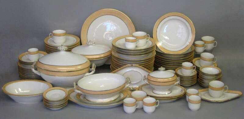 Having a peach band with gilt to each edge and white ground. Comprising twelve luncheon plates, fifteen soup bowls, one circular platter, fourteen salad plates, nine bread & butter plates, one oval platter, one sauceboat with tray, two oval vegetable dishes, ten demitasse cups and thirteen saucers, seven teacups and saucers, one covered twin handled soup tureen with finial, one twin handled oval covered vegetable with finial, eight sauce dishes, three oval relish dishes (one of a slightly different pattern), two diamond shaped underplates, and three larger saucers.