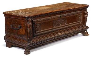 Italian carved walnut and iron mounted cassone 17th century