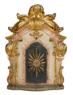 The scalloped crest over arched door applied to show a sunburst, flanked by faux marble and ivory tone painted frieze.