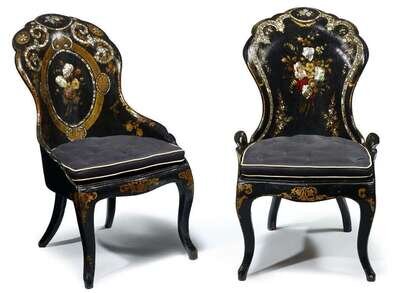 Pair of Victorian mother of pearl inlaid black lacquered papier mache side chairs