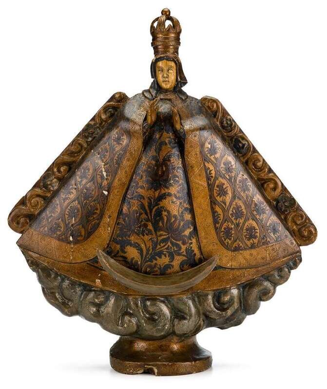 Carved to show a crowned Virgin with ivory face, her hands held in blessing, wearing a wide robe punch decorated and painted with flowers, above a crescent and cloud swirl, on semi-circular base.