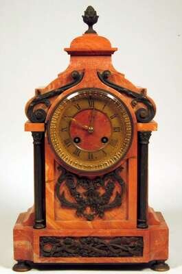 The circular chapter ring with roman hour markers, flanked by fluted corinthian columns, the architectural marble case surmounted by a basket finial.