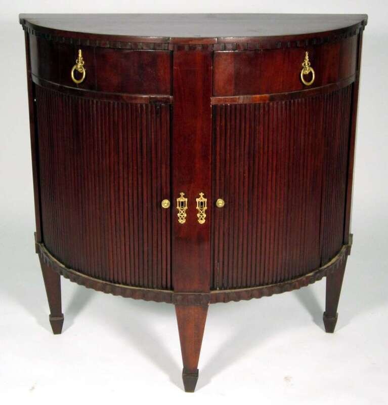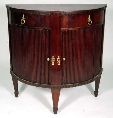 The D-shaped top over two conforming drawers over folding tambour doors, raised on square legs.