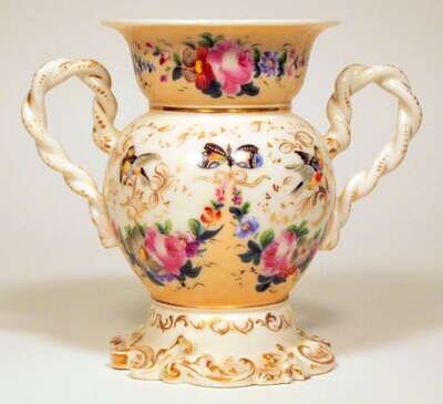 The everted rim over baluster body flanked by twin rope twist handles raised on scrolled molded base, enameled to show butterflies and foliate sprigs.