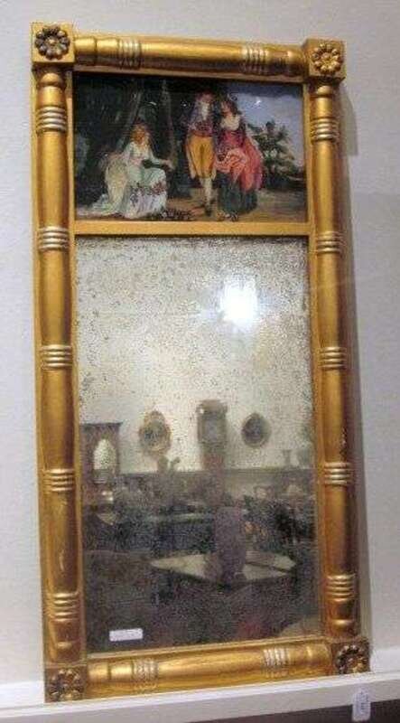 The tall rectangular plate, surmounted by painted figural scene, in simulated bamboo giltwood frame.