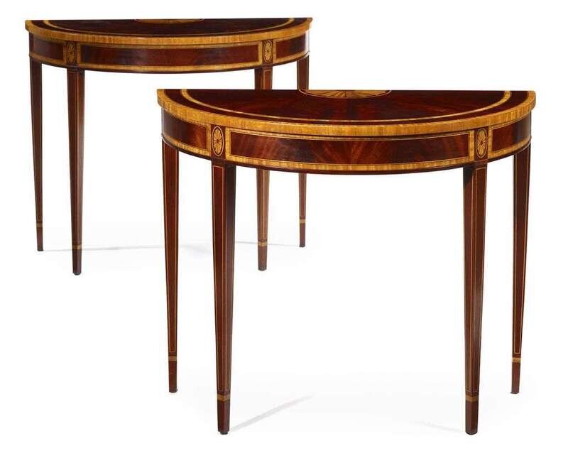 The demi-lune tops over conforming inlaid frieze raised on square tapering legs.