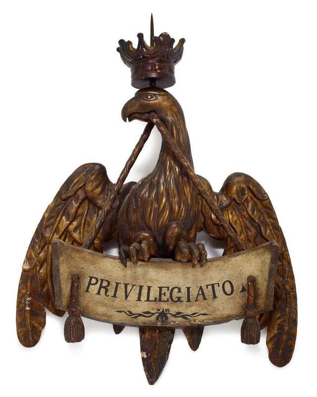 The crowned eagle surmounted with iron post, grasping ribbon tied banner reading 'PRIVILEGIATO."