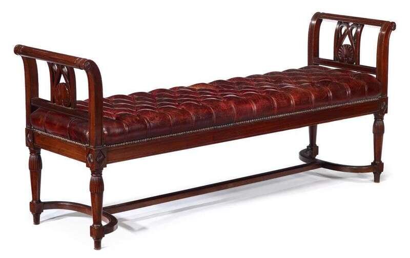 The scroll shaped ends flank an over stuffed diamond button down brown leather seat, raised on joined cylindrical legs.