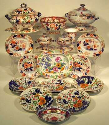 Comprised of two covered tureens, pair of small covered soup tureens over stands, sixteen various plates or undertrays, a vase and large bowl, all decorated in the Imari pallette. (23).