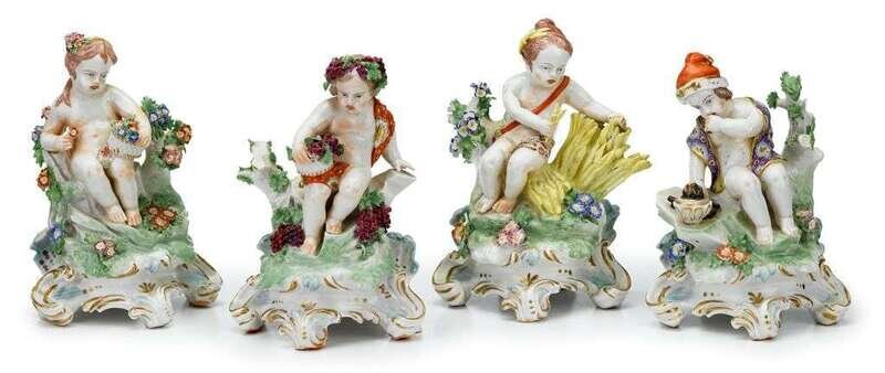 Each modeled as a putti seated on a naturalistic base with flowers and gilt scrolls, possibly Derby.