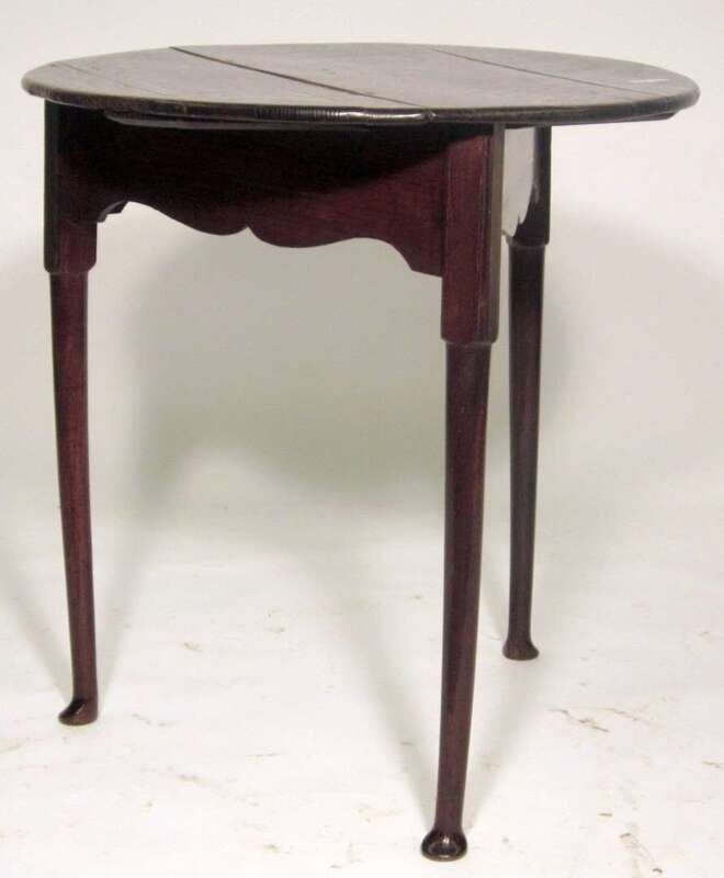 The circular planked top over triangular base with three tapering legs terminating in pad feet.