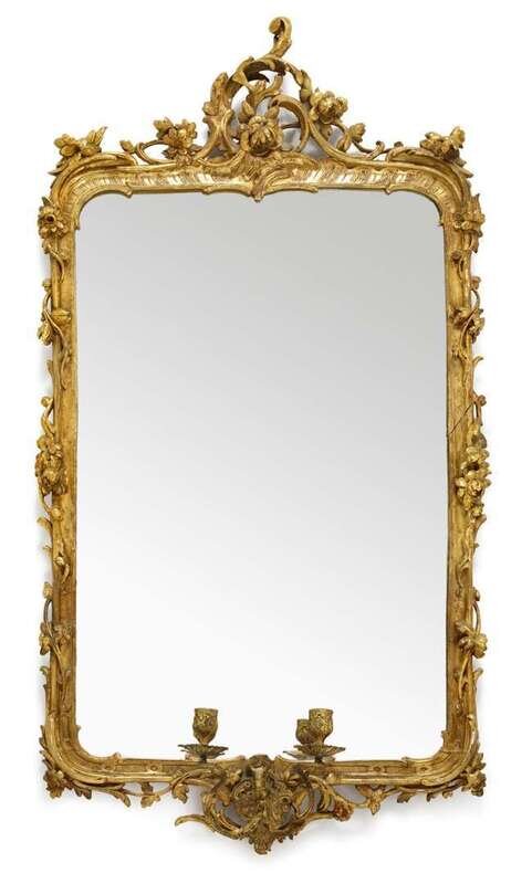 Tall rectangular plate framed by S and C shaped foliate scrolls, the base issuing twin gilt metal candle arms.