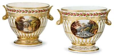 Pair of Derby porcelain gilded topographical cache pots early 19th century
