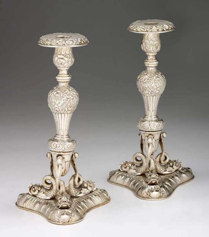 The baluster form stems cast to show flowerheads, raised on three dolphin supports on tripartite bases.