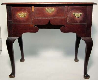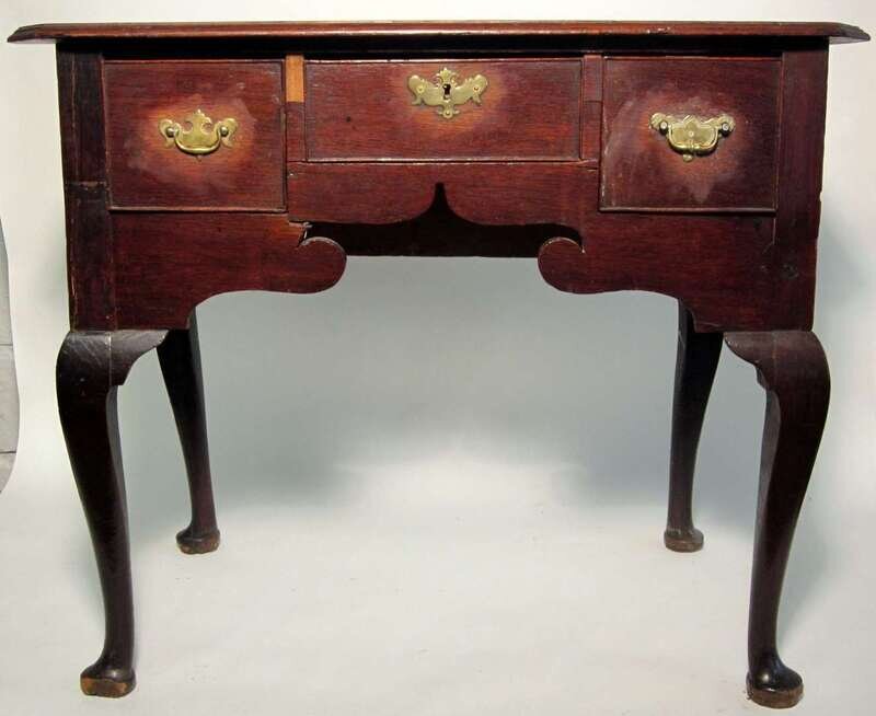 The molded rectangular top over a base fitted with three drawers raised on tall cabriole legs, terminating in pad feet.