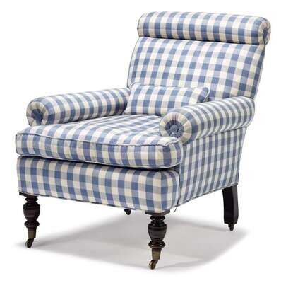 The upholstered back and sides supporting loose cushion seat, raised on turned fore legs and square rear legs, terminating in brass castors.