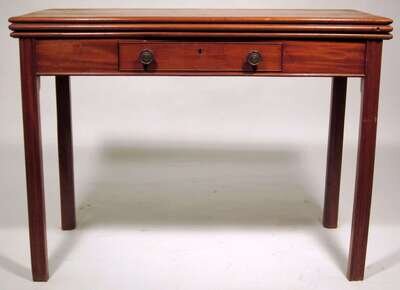 The twin folding rectangular top, supported by gate-leg base, opens to reveal green baize playing surface, over single drawer to the frieze, raised on square legs.