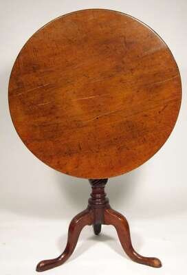 The free-moving circular top above carved tapering baluster stem, raised on shaped tripod legs and pad feet.